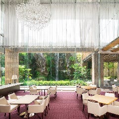滝が望める開放的なラウンジ